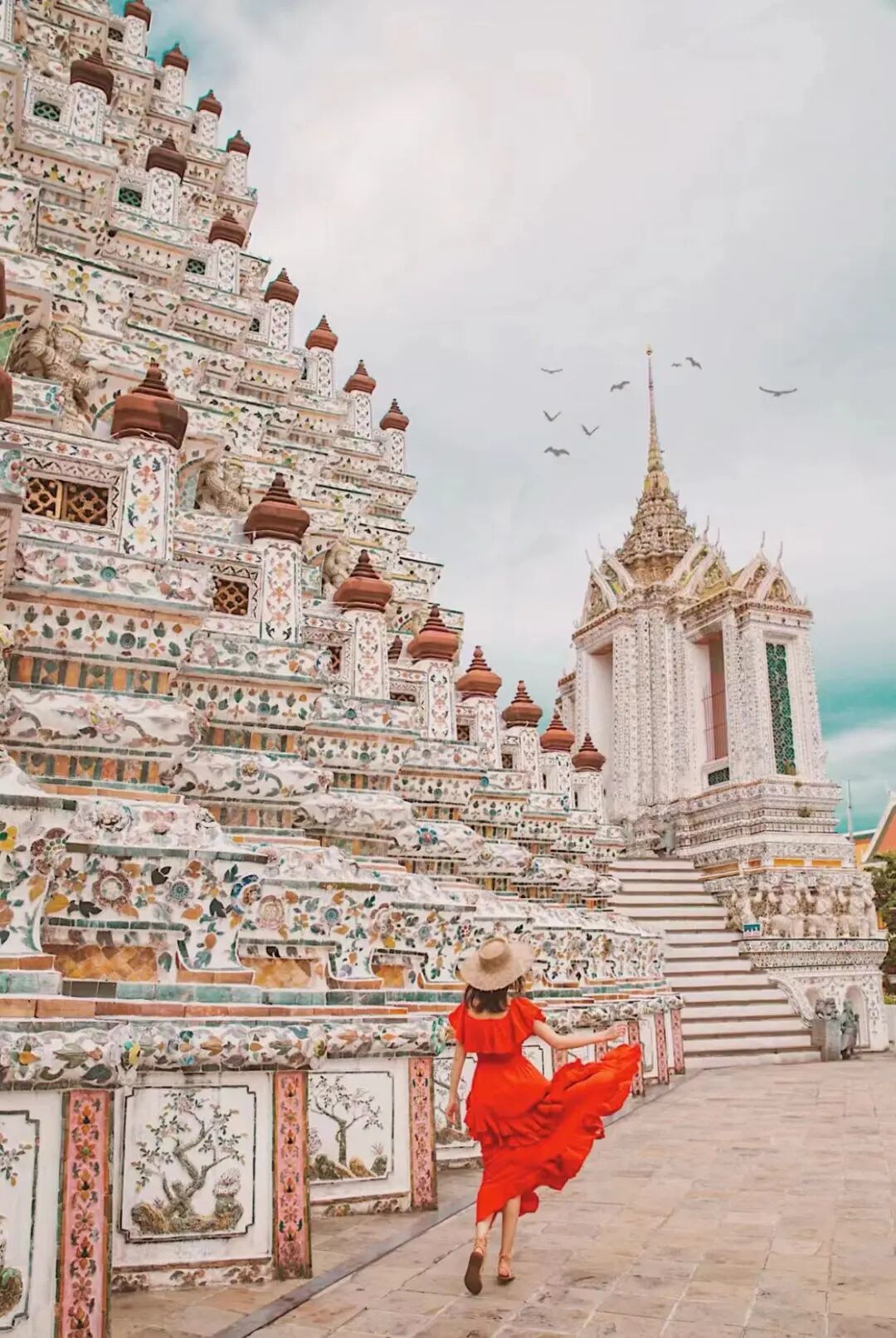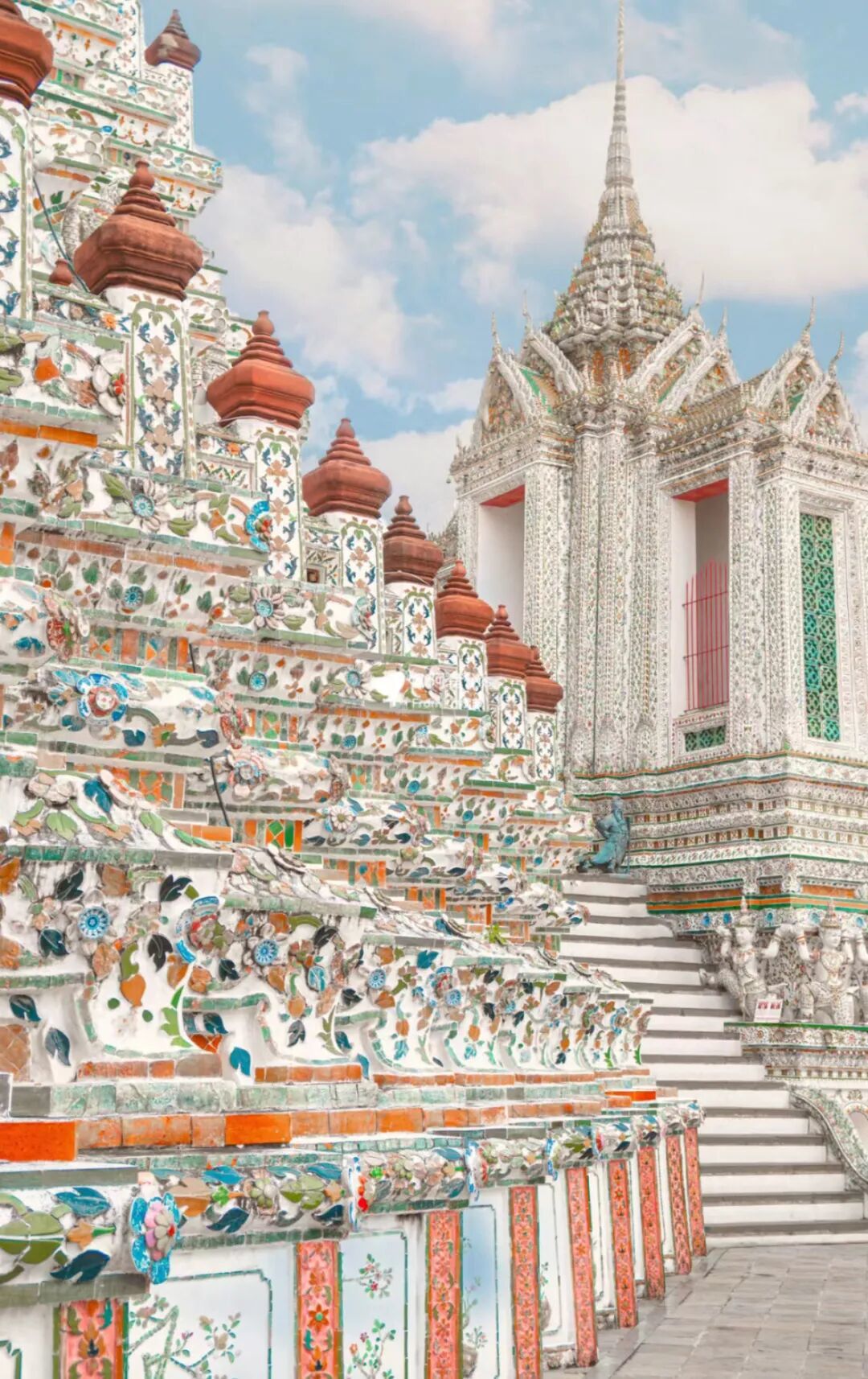 它还有个很有意境感的名字叫“黎明寺”,在高大的主塔旁边修建着四座小塔,表面镶嵌了不少彩色瓷片,从近处看还是很美的(门票100泰铢、8:00-16:00)。