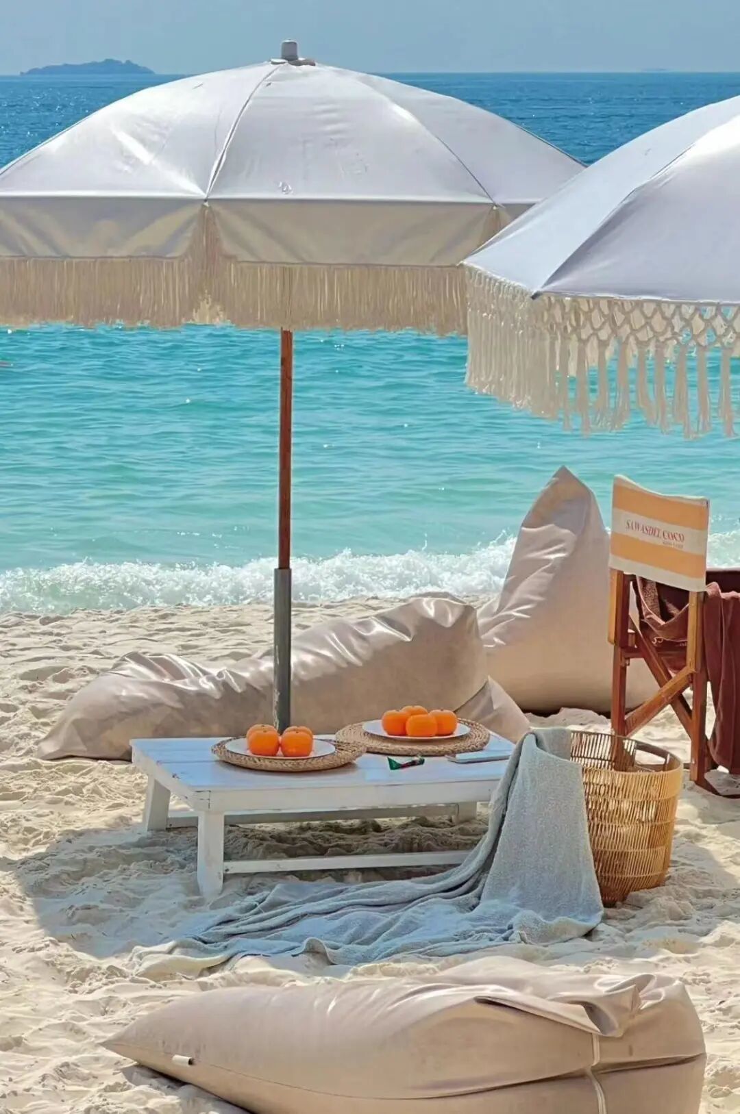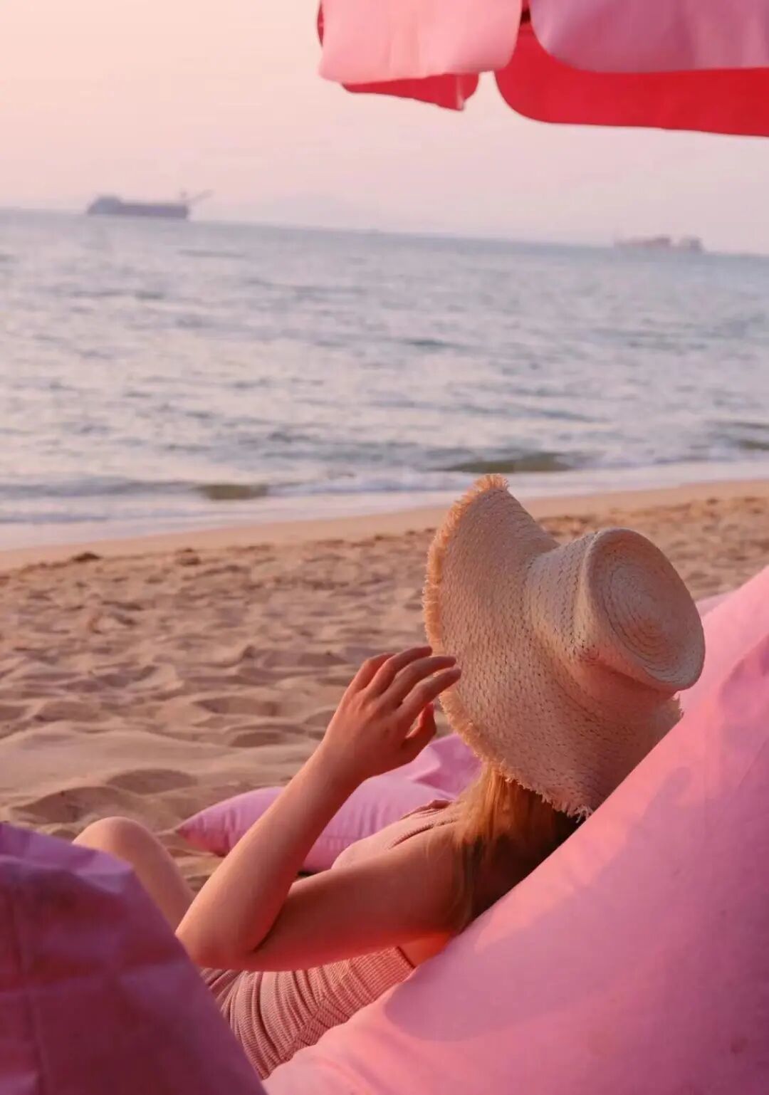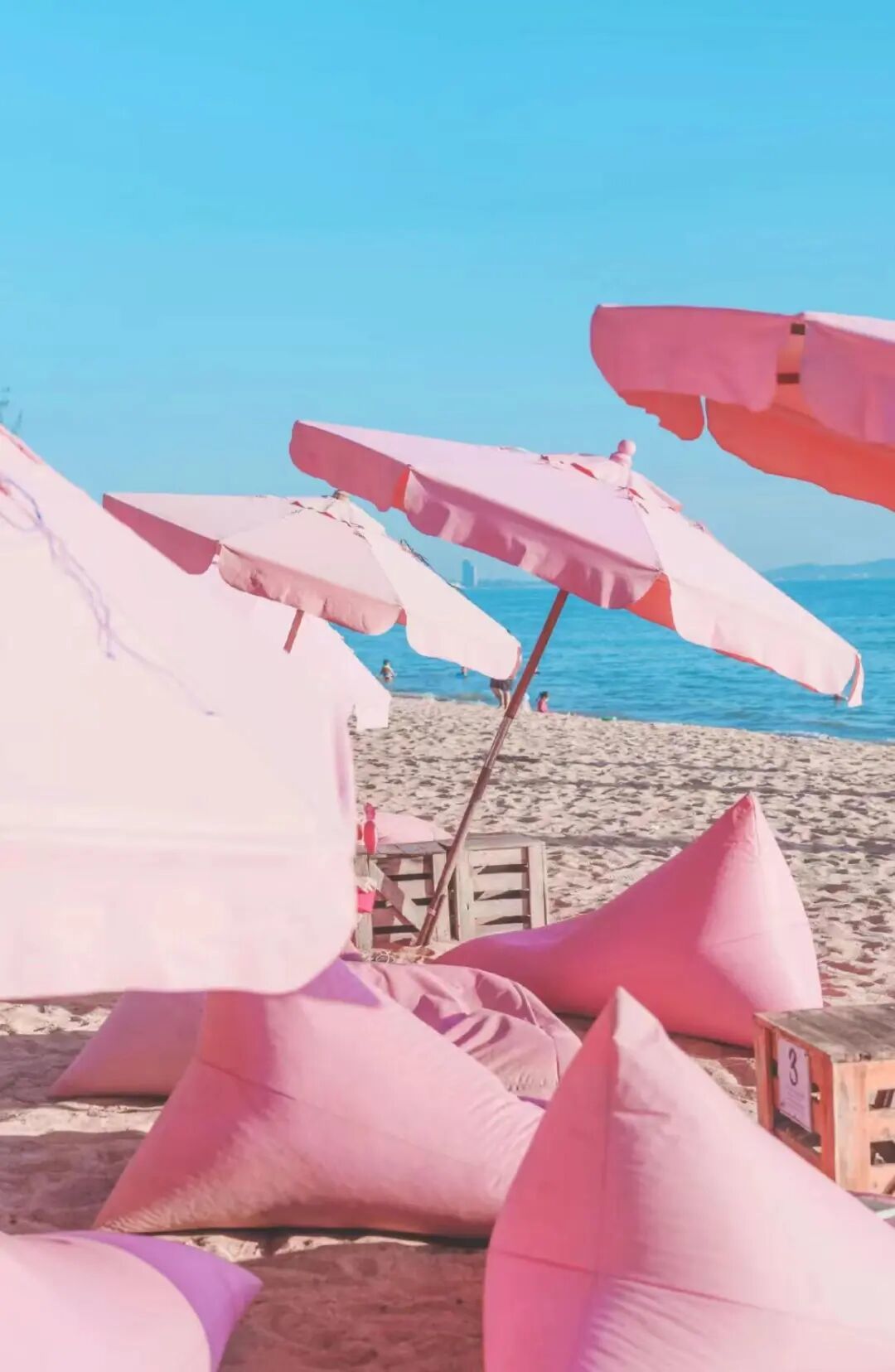 海滩上有很多粉色的太阳伞和粉色的懒人沙发,简直击中了少女心。坐在这看一轮橘子味的落日,这不就是大家向往的小美好么。