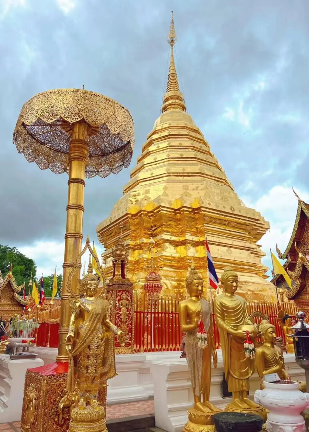 素贴山的「双龙寺」是清迈著名的佛教圣地,也是清迈的地标性寺庙,塔内供奉着佛陀的圣物和宝物,门前还有309级台阶,两侧被两条长龙雕塑守护,所以叫双龙寺。
