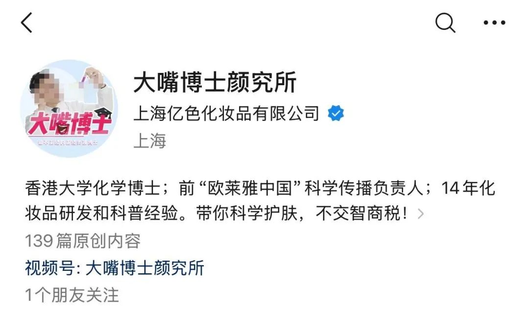 公众号“大嘴博士颜究所”简介显示,该博主自称为香港大学化学博士、前“欧莱雅中国”科学传播负责人。