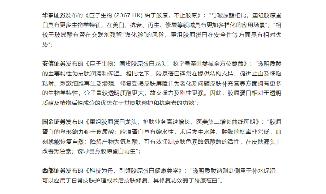 虽然华熙生物未直接点名,但从文中罗列的券商研报内容来看,“某重组胶原企业”指向在港股上市的美妆护肤企业巨子生物。