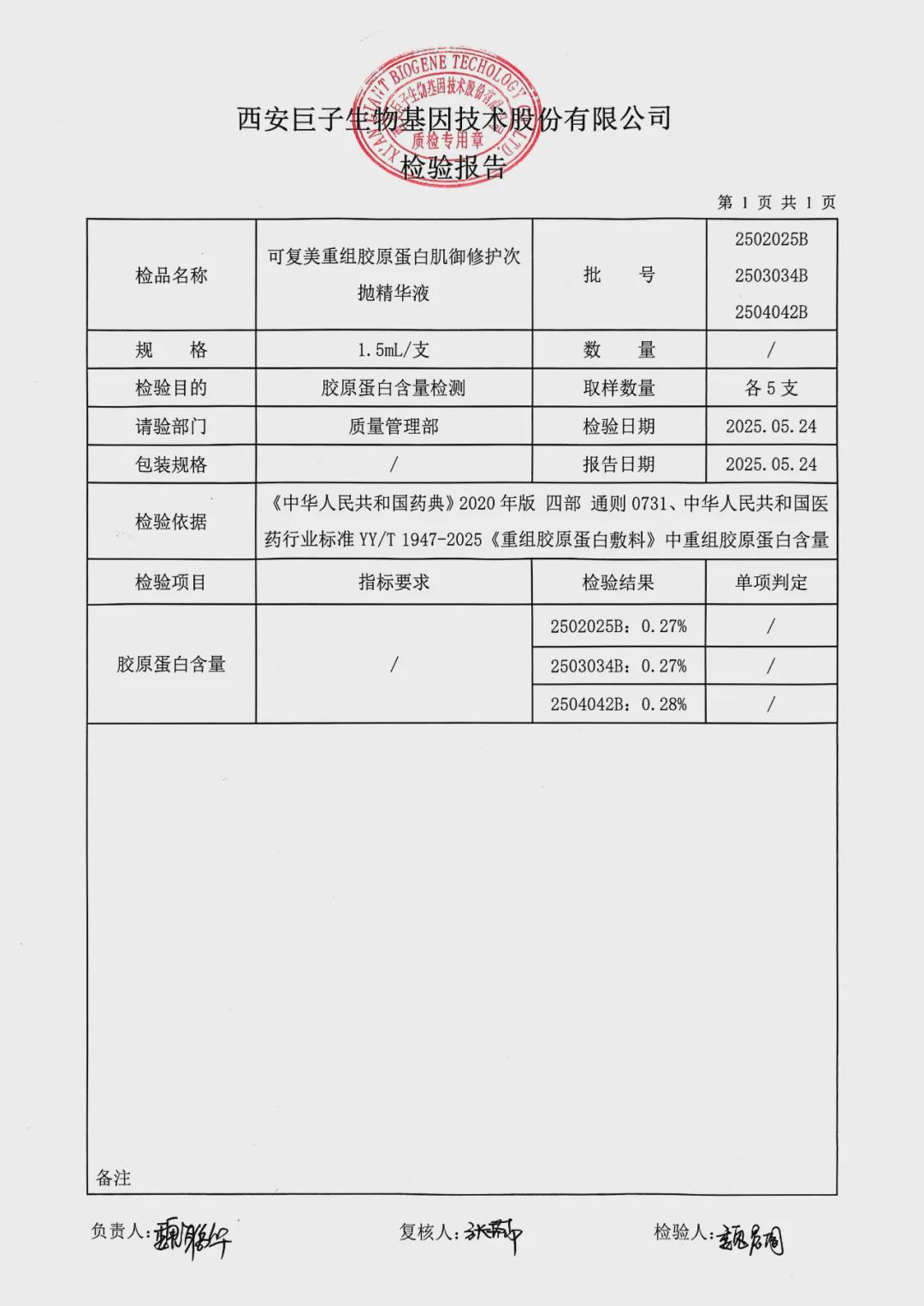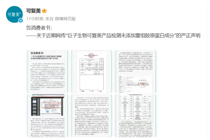 可复美发布的声明称,针对所谓“巨子生物涉嫌严重造假”“重组胶原测不到”等不实指控,公司予以严正驳斥并坚决否认。其郑重声明:上市产品均经原料投料核查、生产工序质控、成品质量检测三重验证体系,确保产品质量安全可靠,不存在任何成分造假或隐瞒行为。