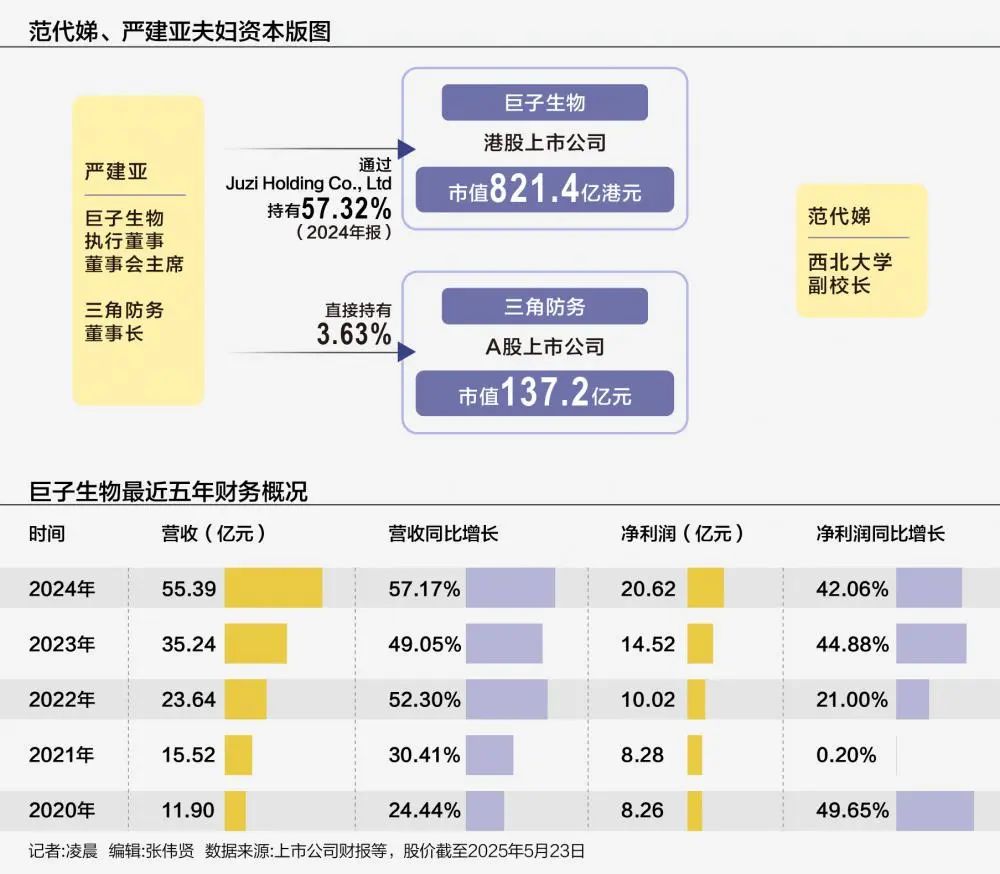 巨子生物于2022年在港股上市,范代娣夫妇通过juzi holding持股56.5%。三角防务则于2019年成功登陆创业板,严建亚通过三森实业、西安鹏辉及直接持股等,合计控制16.09%股权,穿透后,其实际持股13.77%。