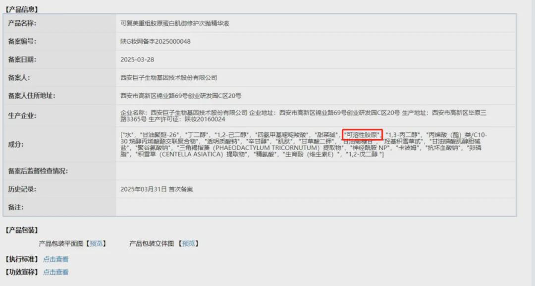 另根据国家药监局《化妆品标签管理办法》相关规定,及相关产品在国家药监局国产普通化妆品备案信息系统中可查信息显示,该产品的“可溶性胶原”成分因其添加量大于0.1%(w/w),故而由“成分”作为引导语引出,且根据添加量多少,排序为第七位,与网传的“0.0177%添加量”严重不符。