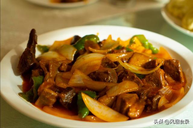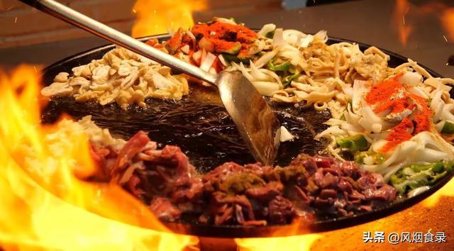 架起铸铁鏊子,烧旺炭火,先泼半勺羊油,炸香洋葱辣椒,倒进煮好的羊肝、肺、肚、肠猛火爆炒。