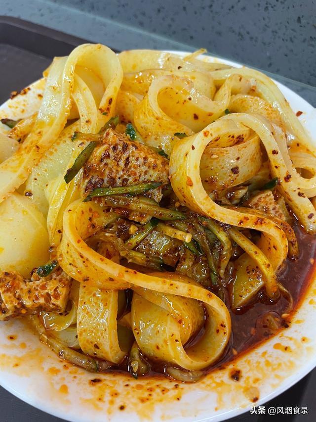 出锅的酿皮橙黄透亮,切成条,那是柔韧筋道,Q弹得能在嘴里跳舞。